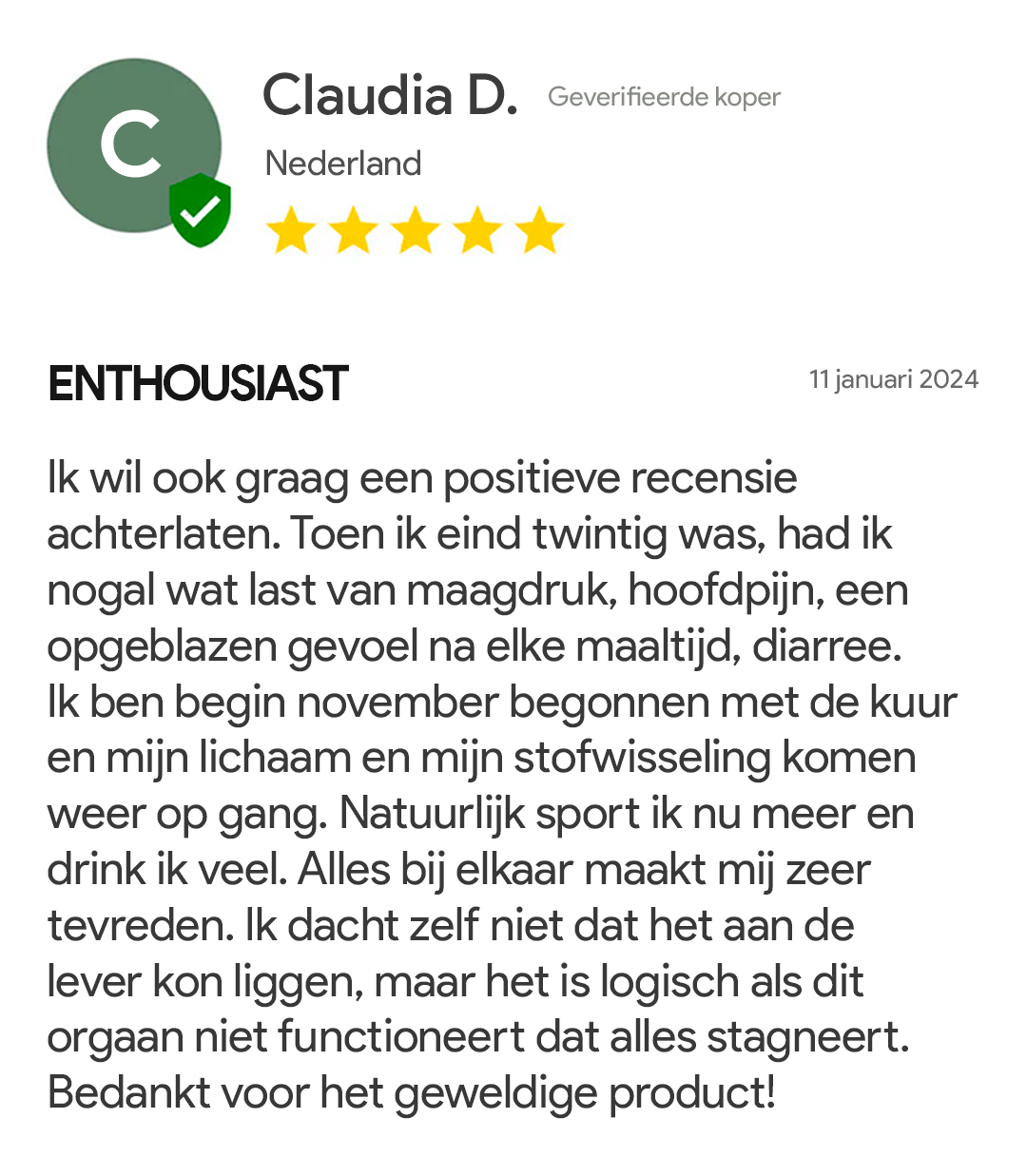 De vervelende opgeblazen buik waar ik al zo lang last van had verdween, en zelfs mijn huid zag er frisser uit, wat mijn man ook opmerkte.