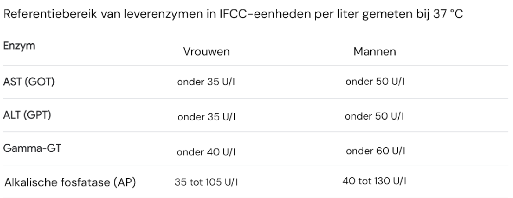 Bij vrouwen moet de waarde absoluut onder de 40 U/l liggen.